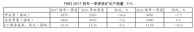 2017年三季度(2017财年一季度),澳大利亚第三大铁矿石生产商FMG铁矿石开采量环比和同比分别减少14.6%和7.7%至4570万吨;铁矿石发货量环比小幅下滑1.6%至4400万吨,但同比保持基本稳定(微增0.5%)。