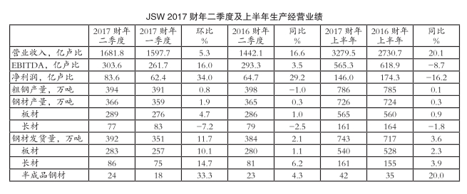2017财年上半年,受益于钢材销量增加和平均销售价格上涨,JSW营业收入同比显著增长20.1%至3279.5亿卢比;EBITDA则同比下滑8.7%至565.3亿卢比;净利润同比大幅下滑16.2%至146.0亿卢比。2017财年上半年,JSW资本支出总额为219.6亿卢比。(植恒毅)