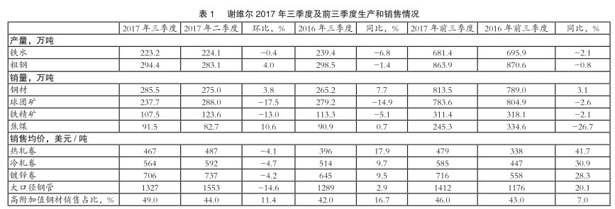 从2017年前三季度来看,谢维尔铁水产量为681万吨,同比小幅下滑2.1%;粗钢产量为864万吨,同比微降0.8%。