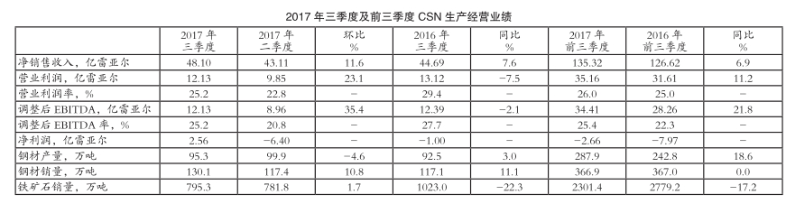 从前三季度来看,CSN净销售收入达到135.32亿雷亚尔,同比增长6.9%;营业利润为35.16亿雷亚尔,同比大幅增长11.2%;营业利润率由2016年前三季度的25.0%小幅增长至26.0%;调整后EBITDA为34.41亿雷亚尔,同比显著增长21.8%;调整后EBITDA率由2016年前三季度的22.3%提升至25.4%;净利润亏损额由2016年前三季度的7.97亿雷亚尔缩减至2.66亿雷亚尔。相关资讯