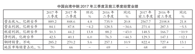 中国台湾中钢公司近期公布其2017年三季度合并业绩(包括中龙钢铁和中鸿钢铁)。该公司三季度钢材销量环比和同比分别增长5.6%和10.9%至285万吨(该销量仅包括母公司单独数据,不包括附属公司和子公司销量,下同);受益于台湾地区钢材价格回升,其营业收入环比和同比分别增长4.8%和20.8%至889.2亿新台币(约合29.7亿美元)。此外,由于台湾地区钢材需求季节性回升,中钢钢材产品内销比例由二季度的66%小幅