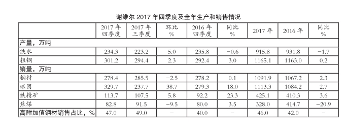 2017年,谢维尔铁水产量同比小幅下滑1.7%至916万吨;粗钢产量同比微增0.2%至1165万吨。