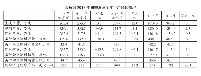 俄罗斯马格尼托哥尔斯克钢铁公司(MMK,简称俄马钢)公布的2017年四季度报告显示,该公司生铁产量环比和同比分别增长3.7%和12.0%至265万吨;粗钢产量环比维持基本稳定(微降0.9%),同比小幅增长4.2%至329万吨。同期,俄马钢钢材产量环比和同比分别下滑11.1%和3.1%至282万吨。其中,高附加值钢材产量环比和同比分别减少10.0%和2.4%至120万吨;高附加值钢材产量占比由三季度的41.9%小幅提升至42.4%,略高于2016年四季度的42.0%。四季度是俄罗斯国内钢材需求淡季,俄马钢钢材销量环比和同比分别下滑12.5%和3.1%至283万吨,其中,高附加值钢材销量环比和同比分别减少13.8%和4.8%至126万吨;高附加值钢材销量占比由三季度的45.4%小幅回落至44.7%,且低于2016年四季度的45.5%。