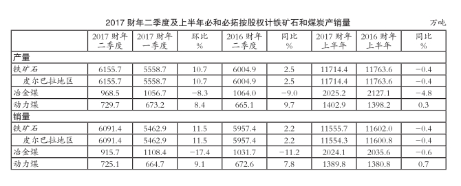 2017财年二季度(2017年四季度),受益于旗下西澳皮尔巴拉地区的吉姆布莱巴铁矿(Jimbl ebar)和C矿区产量再创新高以及其他铁矿提高生产效率,弥补了鲸背山铁矿(Mt Whal eback)选矿厂火灾导致的库存下降以及部分矿山按计划停产检修带来的负面影响,必和必拓西澳皮尔巴拉地区铁矿石产量(按所属股权计,下同)环比和同比分别增长10.7%和2.5%至6156万吨(按100%股权计铁矿石产量为7161万吨,换算成全年产量高达2.84亿吨,再创历史新高)。由于港口扩建工作已于2017年12月完工,第二财季必和必拓西澳皮尔巴拉地区铁矿石销量环比和同比分别增长11.5%和2.2%至6091万吨(按100%股权计为7073万吨),预计下半财年铁矿石销量将进一步增长。巴西萨马科球团厂受停产影响,第二财季球团销量为零。同时,必和必拓继续与澳大利亚环境管理部门协商,旨在将铁矿石年出口限额由2.70亿吨提升至2.90亿吨(按100%股权计)。