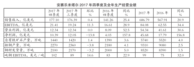 安赛乐米塔尔公司2017年四季度及全年业绩报告显示,四季度受北半球钢材市场传统需求淡季影响,其粗钢产量环比小幅下滑,钢材发货量环比也出现小幅下降。四季度,虽然安赛乐米塔尔钢材平均销售价格环比进一步上涨,但是受钢材和铁矿石发货量环比减少以及铁矿石售价环比下跌等负面因素影响,安赛乐米塔尔四季度销售收入环比仅微增0.4%至177.10亿美元,同比则显著增长25.4%;息税、折旧及摊销前利润(EBITDA)环比和同比分别大幅增加11.3%和28.9%至21.41亿美元;营业利润环比稳定在12.34亿美元,同比则显著上涨52.5%;净利润环比大幅下滑13.8%至10.39亿美元,这主要是由于四季度汇兑及其他财务净亏损高达2.61亿美元,同比却激增157.8%。