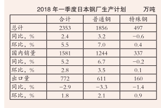 根据日本经济产业省最新调查,2018年一季度日本钢铁生产商计划将粗钢产量提高至2670万吨,同比和环比分别增长1.8%、1.2%;钢材产量将达到2353万吨,同比和环比分别增长2.4%、5.5%。