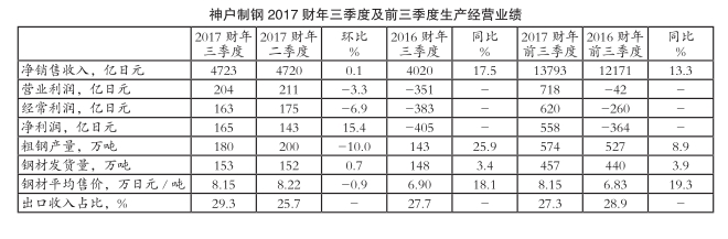 从2017财年前三季度来看,神户制钢公司净销售收入同比大幅增长13.3%至1.38万亿日元;营业利润由2016财年前三季度的亏损42亿日元转为盈利718亿日元;经常利润由2016财年前三季度的亏损260亿日元转为盈利620亿日元;净利润由2016财年前三季度的亏损364亿日元转为盈利558亿日元。