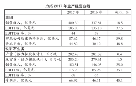 力拓首席执行官让-塞巴斯蒂安-雅克(Jean-Sebastien Jacques)在公布2017年业绩时表示,2017年国际市场铁矿石和焦煤均价较2016年上涨,同时其他大宗商品市场价格适度复苏,但是受一季度澳大利亚灾害天气影响,铁矿石产量和发货量仅同比小幅增长。尽管如此,力拓凭借国际一流的优质铁矿石资产,并通过提高生产效率及相关基础设施利用率进一步降低生产成本,这使力拓EBITDA和现金流持续增长,财务稳健性进一步增强。2017年,力拓营运现金流达到139亿美元,自由现金流增至95亿美元(其中4亿美元来自生产效率提高)。截至2017年12月31日,力拓集团净债务总额降至38亿美元。
