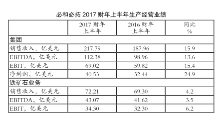 必和必拓铁矿石部门2017财年上半年也受益于铁矿石开采量、发货量稳定以及铁矿石平均销售价格上涨,销售收入同比小幅增长4.2%至72.21亿美元;EBITDA同比小幅上扬3.5%至43.07亿美元;EBIT同比增长6.2%至34.30亿美元。