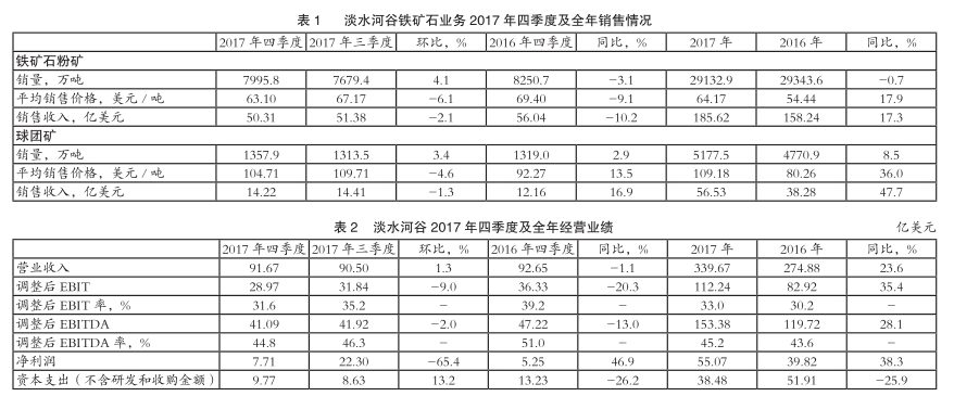 四季度,淡水河谷公司实现营业收入91.67亿美元,环比小幅增长1.3%,这主要受益于铁矿石销量增长和基本金属价格上涨,同比则小幅下滑1.1%。同期,淡水河谷公司调整后息税前利润(EBIT)环比和同比分别减少9.0%和20.3%至28.97亿美元;调整后EBIT率由三季度的35.2%下滑至31.6%,且低于2016年四季度的39.2%;调整后息税、折旧及摊销前利润(EBITDA)环比小幅下滑2.0%至41.09亿美元,这主要是由于基本金属和煤炭价格上涨、铁矿石销量增长以及基本金属生产成本下降,部分抵消了铁矿石价格下滑带来的负面影响,同比降幅为13.0%;调整后EBITDA率由三季度的46.3%下滑至44.8%,且低于2016年四季度的51.0%;净利润环比骤降65.4%至7.71亿美元,这主要是受汇兑损失影响,同比则显著增长46.9%。