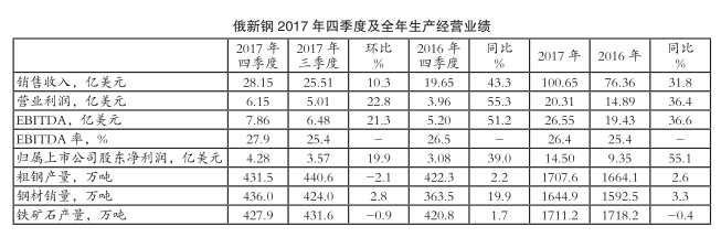 受以上因素共同影响,四季度俄罗斯新利佩茨克钢铁集团(NLMK,简称俄新钢)钢材销量为436万吨,环比和同比分别增长2.8%和19.9%,这主要得益于国际市场钢材(特别是半成品钢材)需求增长,以及俄新钢旗下俄罗斯长材部门和俄罗斯板材部门增加钢材出口量。受益于国际市场半成品钢材需求量增长以及价格上扬,俄新钢四季度半成品钢材销量环比和同比双双增长,其销售收入环比和同比分别增长10.3%和43.3%至28.15亿美元。四季度,俄新钢销售成本随产品销量增加而增长。但受益于钢材销量增长、成品钢材与原材料之间的价差进一步扩大以及半成品钢材销售出口利润率增加,俄新钢四季度营业利润环比显著增加22.8%至6.15亿美元,同比增幅高达55.3%。四季度,俄新钢息税、折旧及摊销前利润(EBITDA)环比显著增长21.3%至7.86亿美元,同比增幅高达51.2%;EBITDA率由三季度的25.4%进一步提升至27.9%,且高于2016年四季度的26.5%;净利润环比大幅增长19.9%至4.28亿美元,同比显著增长39.0%。