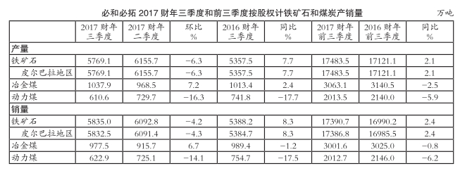 尽管2017财年前三季度铁矿石产销量同比小幅增长,但是受自卸矿车运输及装卸问题影响,必和必拓预测第四财季铁矿石产销量会小幅下滑,因此下调2017财年铁矿石权益矿产量目标至2.36亿-2.38亿吨(原预测值为2.39亿-2.43亿吨),按100%股权计铁矿石产量目标下调至2.72亿-2.74亿吨(原预测值为2.75亿-2.80亿吨)。