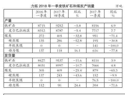 一季度,力拓煤炭产量环比和同比分别显著减少32.8%和71.4%至272万吨;煤炭销量环比和同比分别显著减少25.4%和65.3%至305万吨。