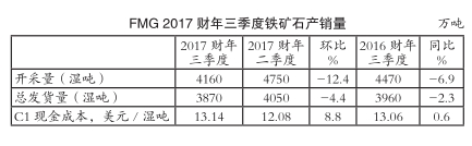 一季度,FMG铁矿石生产的C1现金成本(含采矿、加工、铁路运输及港口费用)由2017年四季度的12.08美元/湿吨小幅增加至13.14美元/湿吨。2017财年前三财季,FMG铁矿石生产的C1现金成本为12.43美元/湿吨,如果按照澳元兑美元汇率为0.75以及美国西德克萨斯轻质原油WTI价位为53美元/桶换算,前三财季C1现金成本仅为11.90美元/湿吨。此前,FMG基于澳元兑美元汇率为0.75以及美国西德克萨斯轻质原油WTI价位为53美元/桶估算的2017财年C1现金成本低于12.00美元/湿吨,但鉴于汇率及原油价格变化,FMG将2017财年C1现金成本目标上调至12.00-12.50美元/湿吨。