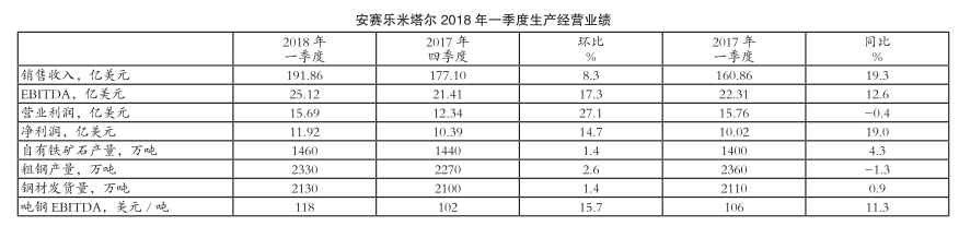 安赛乐米塔尔公司2018年一季度业绩报告显示,一季度虽然是北半球钢材市场传统需求淡季,但受益于北美自贸区和欧洲钢材需求增长,该公司粗钢产量环比小幅增长(但同比小幅下滑);由于旗下北美自由贸易区部门和欧洲部门钢材发货量增长,弥补了巴西部门以及非洲和独联体部门钢材发货量下滑带来的负面影响,一季度该公司钢材发货量环比和同比双双增长。一季度,安赛乐米塔尔不仅钢材发货量增长,钢材平均销售价格上涨,而且按市场定价发货的铁矿石数量环比增加,销售价格也环比上涨。受上述利好因素推动,安赛乐米塔尔一季度销售收入环比增长8.3%至191.86亿美元,同比也大幅增长19.3%;息税、折旧及摊销前利润(EBITDA)环比和同比分别大幅增加17.3%和12.6%至25.12亿美元;营业利润环比显著增长27.1%至15.69亿美元,同比则微降0.4%,这主要是由于美元兑欧元汇率贬值导致折旧和汇兑损失增加;净利润环比和同比分别大幅增长14.7%和19.0%至11.92亿美元,创下单季净利润历史新高。