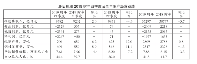 受钢材发货量增加以及钢材平均销售价格下跌等因素共同影响,第四财季JFE控股净销售收入由第三财季的9202亿日元环比小幅增加2.0%至9382亿日元,与2018财年四季度的9831亿日元相比则小幅减少4.6%;营业利润陷入亏损,由第三财季的盈利337亿日元转为亏损2529亿日元,2018财年四季度的营业利润为盈利74亿日元;税前利润也由盈转亏,由第三财季的盈利273亿日元转为亏损2561亿日元,2018财年四季度的税前利润为盈利45亿日元;净利润持续亏损,亏损额由第三财季的50亿日元显著扩大至2247亿日元,2018财年四季度的净利润为盈利71亿日元。