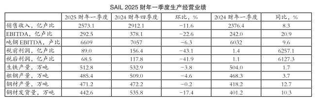 受钢材发货量环比减少、同比增长,冷轧卷销售均价环比上涨以及长材(特别是钢轨)销售均价回落等因素共同影响,印度钢铁管理局2025财年一季度销售收入由2024财年四季度的2912.1亿卢比环比大幅减少11.6%至2573.1亿卢比,与2024财年一季度的2376.4亿卢比相比则增加8.3%;受销售收入大幅减少、炼钢原料成本下降、钢材销售均价下跌,成品钢材与炼钢原料之间的价差小幅扩大以及库存下降等因素共同影响,息税、折旧及摊销前利润(EBITDA)由2024财年四季度的378.1亿卢比环比显著下滑22.6%至292.5亿卢比,与2024财年一季度的242.0亿卢比相比则显著增长20.9%;受EBITDA环比降幅绝对值大于钢材发货量环比降幅绝对值影响,吨钢EBITDA由2024财年四季度的7057卢比环比减少6.3%至6609卢比,与2024财年一季度的6032卢比相比则增加9.6%;税前利润由2024财年四季度的156.4亿卢比环比显著缩水43.1%至89.0亿卢比,与2024财年一季度的1.4亿卢比相比则骤增6257.1%;税后利润由2024财年四季度的117.8亿卢比环比显著下滑41.9%至68.5亿卢比,与2024财年一季度的1.1亿卢比相比则骤增6127.3%。(植恒毅)