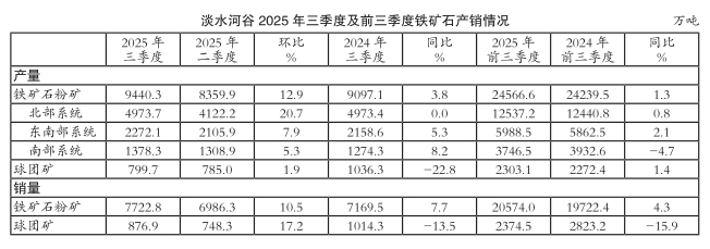 巴西淡水河谷公司近期公布2025年三季度产销量报告。该公司在报告中表示,受益于S11D铁矿项目产量创历史新高以及重点项目持续达产,淡水河谷旗下北部系统、东南部系统和南部系统铁矿石粉矿产量均实现环比增长;受益于铁矿石产量增长,该公司三季度铁矿石粉矿销量也同比大幅提升。鉴于二季度和三季度铁矿石粉矿产量增长抵消了一季度产量下滑带来的负面影响,淡水河谷公司前三季度铁矿石粉矿产量实现同比小幅增长,因此该公司维持2025年铁矿石粉矿产量目标不变。