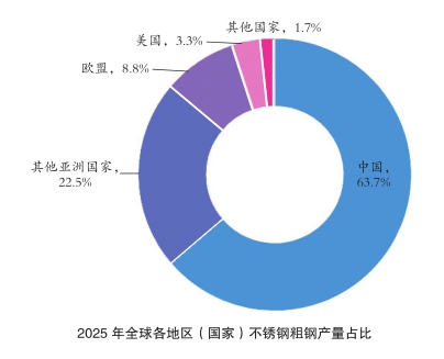 从占比看,中国2025年不锈钢粗钢产量为4086.8万吨,占全球产量比重为63.7%;其他亚洲国家产量为1444.5万吨,占比为22.5%;欧盟27国产量占比为8.8%;美国占比为3.3%,其他国家占比为1.7%。