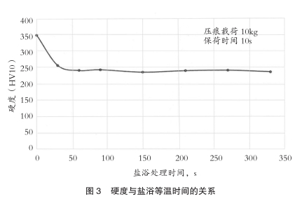 硬度(HV10)随盐浴保温时间的变化在图3中给出。本研究试验结果与早期研究不同,早期研究认为硬度变化归因于化学成分,特别是碳含量和交互应力的作用。另外,还认为随着处理时间延长和临界