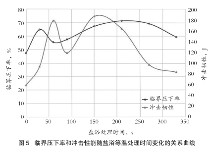 从不同盐浴处理时间后试样的临界压下率结果可以看出,尤其是在150-270s的盐浴处理,含有马氏体的贝氏体组织提高了材料的塑性。变形提高了马氏体形核位置(变形带、位错塞积位置)和贝氏体形核位置(晶界和亚晶界),使钢的塑性更好。