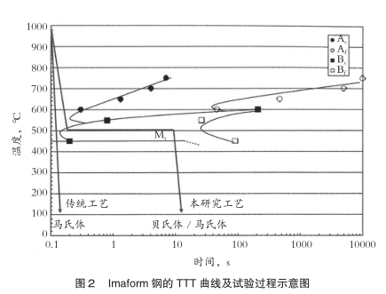 间-温度-转变(TTT)曲线。在经过相等的加热步骤后,从1273K(1000℃)按180℃/s进行加速冷却。为了确定等温转变动力学,在从623-973K(350-700℃)之间9个不同温度点终止冷却。在等温保温过程中,通过膨胀分析测定转变。