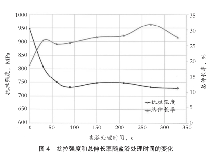 拉伸试验结果表明,未经盐浴处理的试样或盐浴处理30s的试样表现出较高的抗拉强度水平。对那些盐浴处理超过30s的试样,抗拉强度几乎保持不变。强度高是由于组织中存在硬化相马氏体。一些研究认为DP钢的抗拉强度遵守混合规律,不过,其他研究认为抗拉强度与马氏体含量不存在线性关系。
