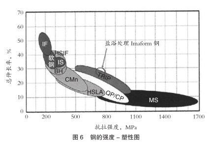 钢的强度-塑性图给出了总伸长率和抗拉强度之间的关系(图6)。试验结果落在相变诱导塑性(TRIP)钢的区域。通常,TRIP钢用于汽车工业,它具有优异的成形性能和高加工硬化率,提高碰撞吸收能量。这些钢通常含0.1%-0.4%C,还有如Mn和Si等其他合金化元素。